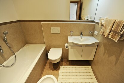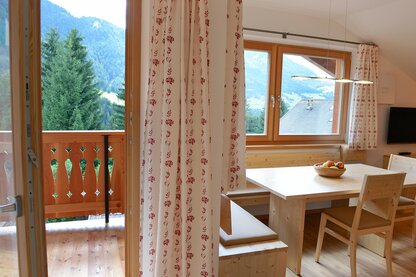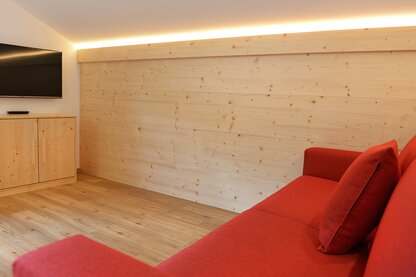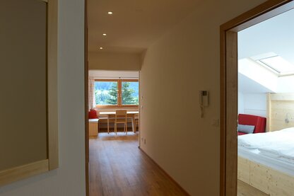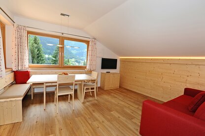 Alle Apartments verfügen über ein geräumiges Wohnzimmer mit gemütlicher Eckbank, Divan (ev. Schlafplatz für 1-2 Personen), Sat-Flachbildschirm und Südbalkon oder -terasse mit Blick auf die Seiser Alm, die Kochnische ist mit Glaskeramikkochfeld, Dunstabzugshaube, Geschirrspülmaschine, Backofen, Kühlschrank mit Gefrierfach und allen Kochutensilien ausgestattet, jedes Doppelbettzimmer hat ein eigenes Badezimmer mit Haartrockner.