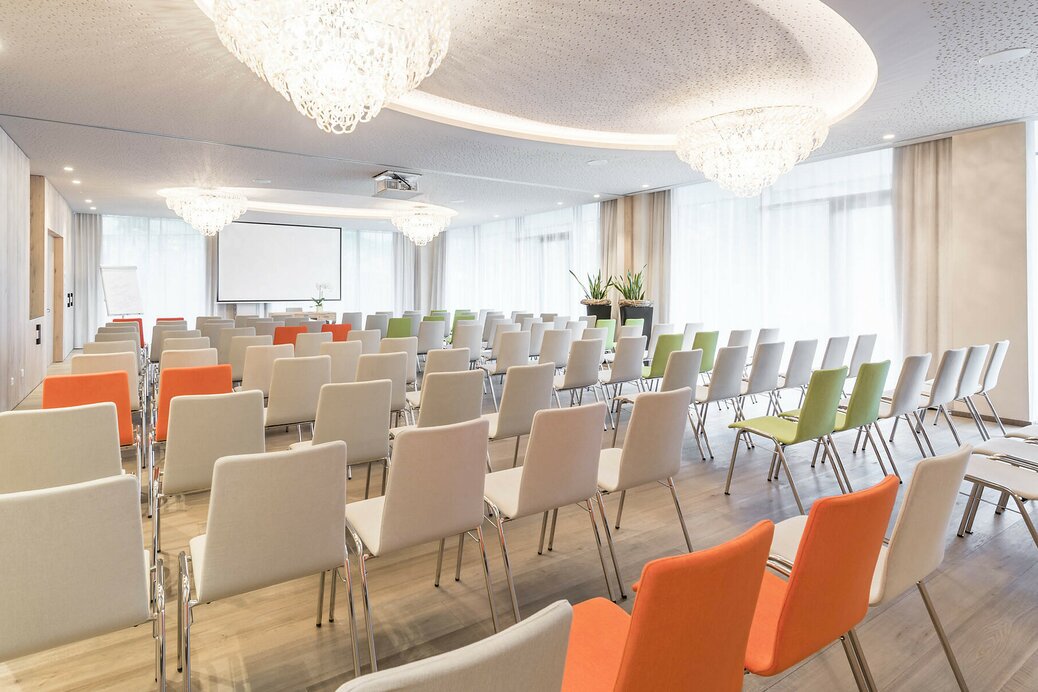 Der Seminarraum „Rosa“ im Schenna Resort bietet auf 58 m² optimale Voraussetzungen für professionelle Seminare, Schulungen und Besprechungen. Die lichtdurchflutete Gestaltung, die Raumhöhe von 2,86 m sowie die ruhige Lage schaffen eine angenehme und konzentrierte Arbeitsatmosphäre.