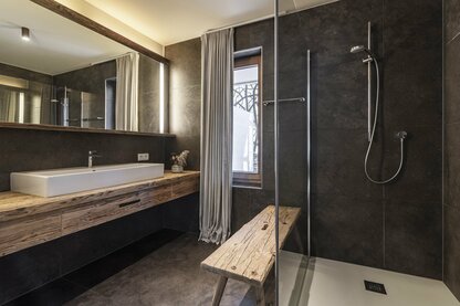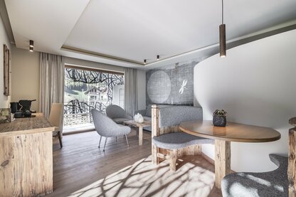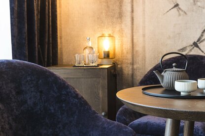 In der südostasiatischen Tee Ecke im Barbereich kommen spannungsvolle Kontraste aus hellem Stein und dunklem Holz, Ferne und Weite, Gemütlichkeit und Geradlinigkeit zum Ausdruck. Es ist der Ort, wo Tees aus Asien auf Südtiroler Kräuteraufgüsse treffen. Wo sich die Wohlfühlgeheimnisse Südtirols und Südostasiens miteinander verbinden. Auf dem Weg dorthin begegnet man ganz besonderen Elementen. Denn auch die Architektur gibt sich der Liebe zum Tee hin und ist eine Interpretation des klassischen Teeweges: dem Weg zu Selbstfindung und Entschleunigung.