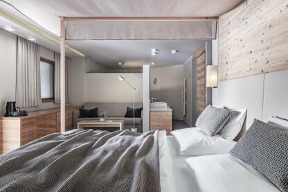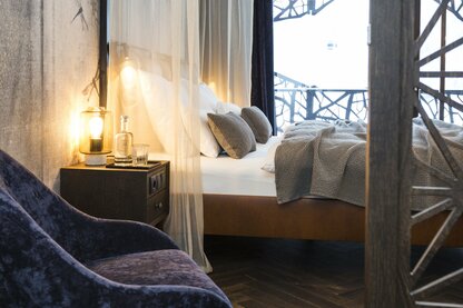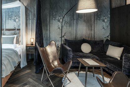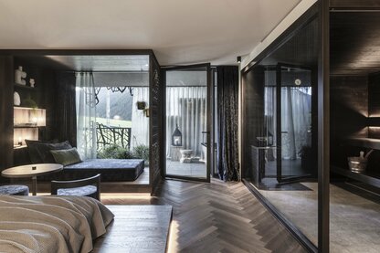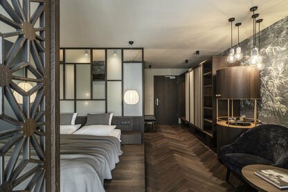 Die weiteren Studios und Suiten zeigen sich durch einen offenen Grundriss, einem offenen Bad und großen Fensterflächen, von denen die Außenfassade ersichtlich ist. Die Holzoberflächen aus Mooreiche und die Tapeten, welche eine Moorlandschaft zeigen unterstreichen das Konzept.