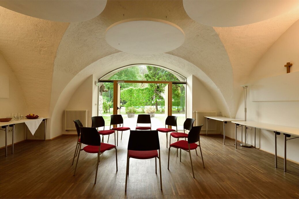 Maria, der Mutter Jesu, ist dieser neu errichtete, bewusst schlicht gehaltene Saal gewidmet, der einen idealen Rahmen für Fort- und Weiterbildungsveranstaltungen bietet. Ganz neu: ein mobiler Bildschirm mit 98-Zoll-Monitor, der die technische Ausstattung komplettiert.