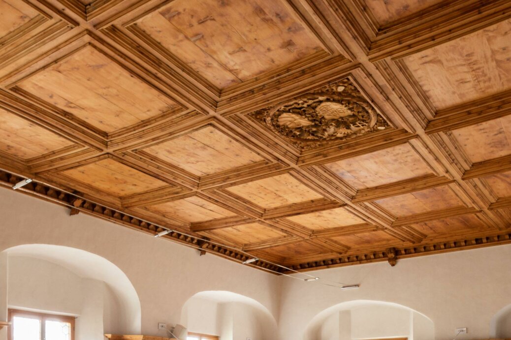 Das Geisterzimmer hat seinen Namen von der Geheimtür und den sich damals dahinter abspielenden eigenartigen Vorkommnissen und von der Holzmaserung bzw. den Intarsien in der Decke.