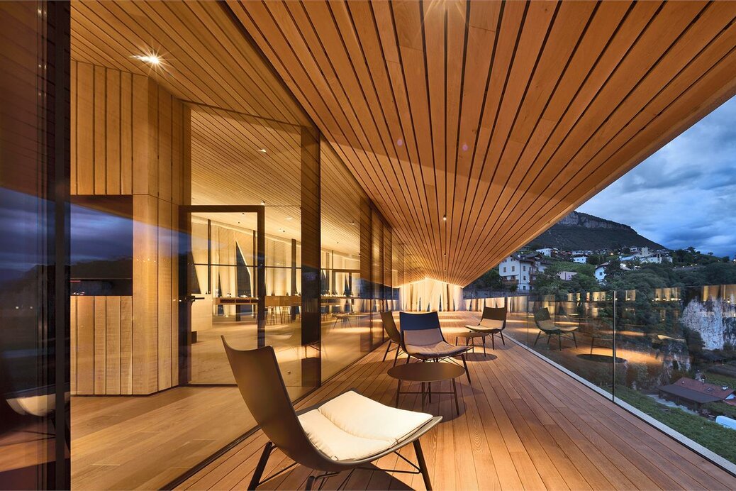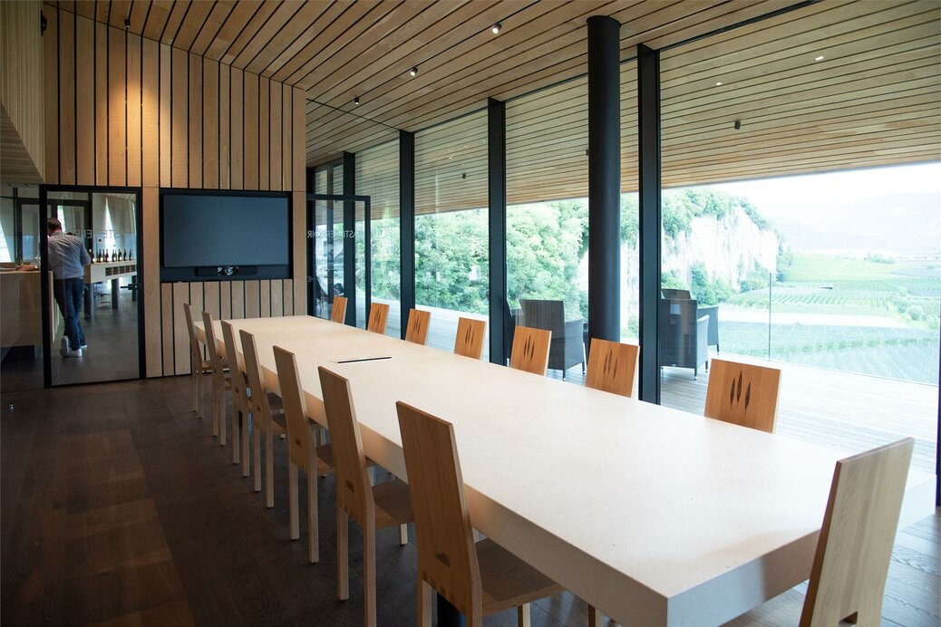 Die Kellerei Kurtatsch liegt im Süden Südtirols und wurde im Jahr 2020 neu gestaltet. Der Neubau, mit seiner repräsentativen „Dolomit“-Fassade, empfängt den Besucher mit einer großzügigen Vinothek mit Panoramablick. Die Fassade ist eine stilistische Nachbildung der „Millawand“, der charakteristischen Felswand aus Dolomit, auf der das Dorf Kurtatsch thront. Der ortstypische Dolomit findet sich, zusammen mit Eiche und viel Glas, auch im restlichen Gebäude als gestalterisches Element. Die Kombination dieser Materialien verleiht den Räumen eine moderne, aber dennoch heimelige Atmosphäre und schafft damit den idealen Ort für Feste, Tagungen, Konferenzen, Geburtstage und Firmenfeiern aber auch Fotoshootings und Filmproduktionen.