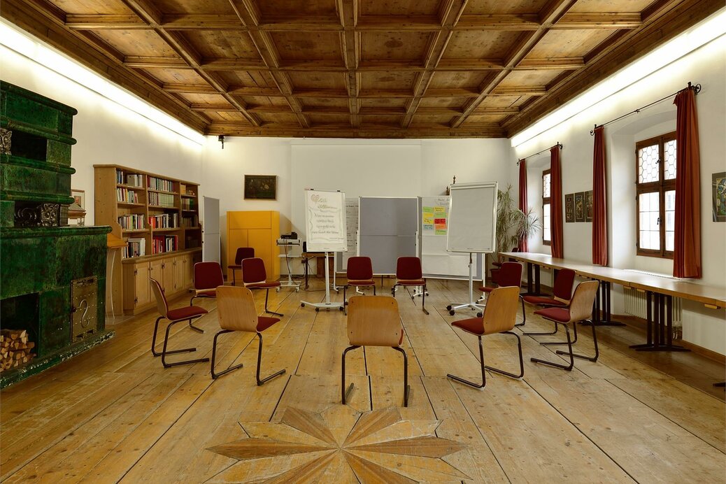 Der Rokoko-Salon ist durch die komplette Wandbemalung einzigartig im Bildungshaus. Er ist unser kleinster Seminarraum und eignet sich besonders für Verhandlungen, für den Austausch oder eine Klausur in kleiner Runde.