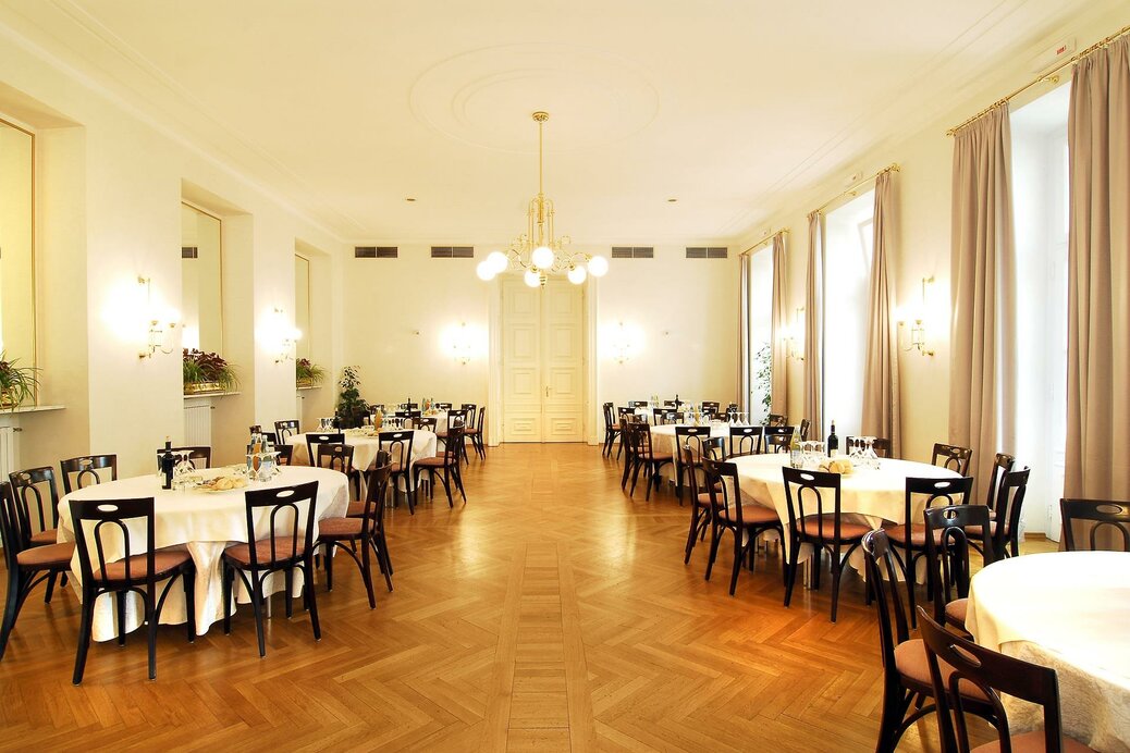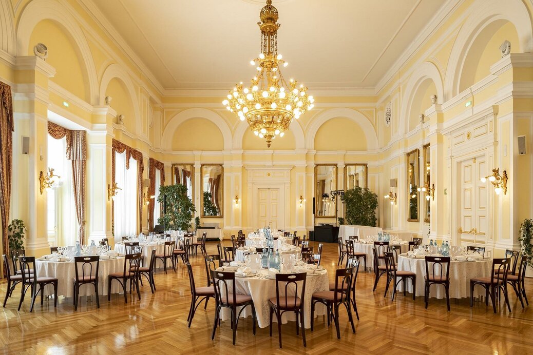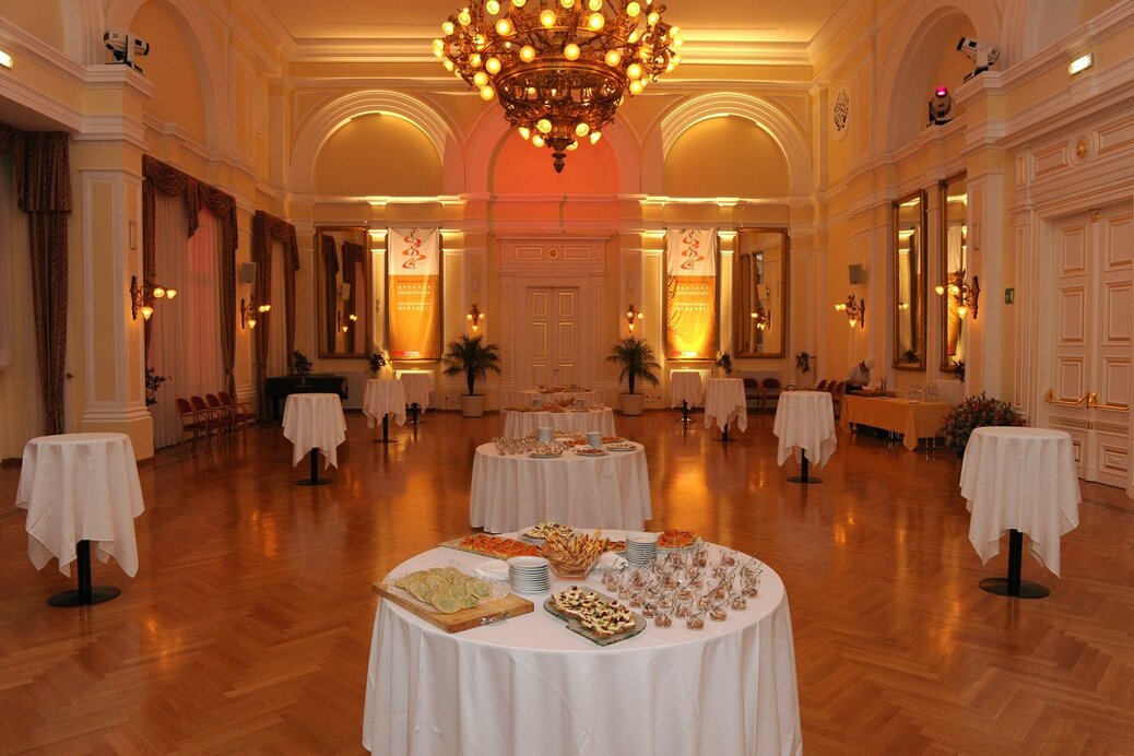 Die großen Spiegel in vergoldeten Rahmen und filigrane Stuckarbeiten im Stil der Neoklassik verleihen dem Saal einen überaus festlichen Charakter.