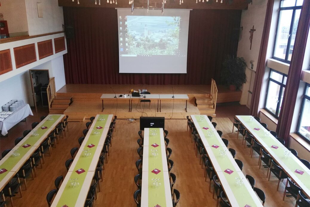 Der große Saal kann nur mit Stühlen oder auch mit Tischen gefüllt werden.