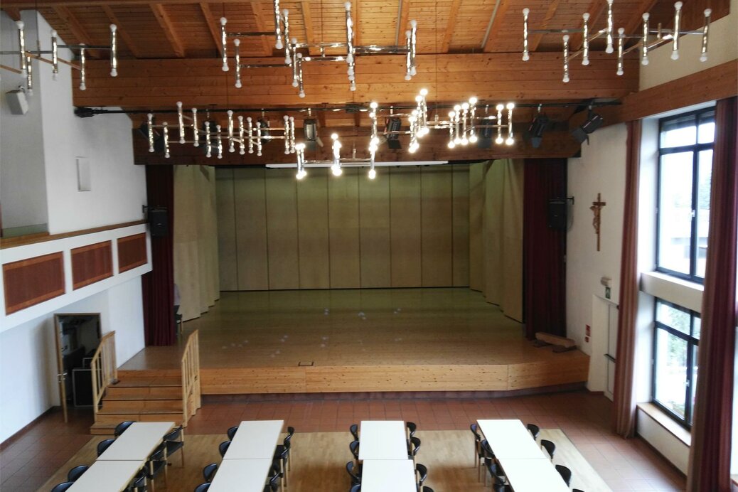 Die Bühne hat einen dazugehörigen Bühnenvorraum und ein Bühnenlagerraum dirket im Anschluss. Ebenfalls hat man von der Innenbühne einen direkten Zugang zur Freibühne welche sich dahinter befindet. Es gibt außerdem mehrere Vorhänge welche in Anspruch genommen werden können
