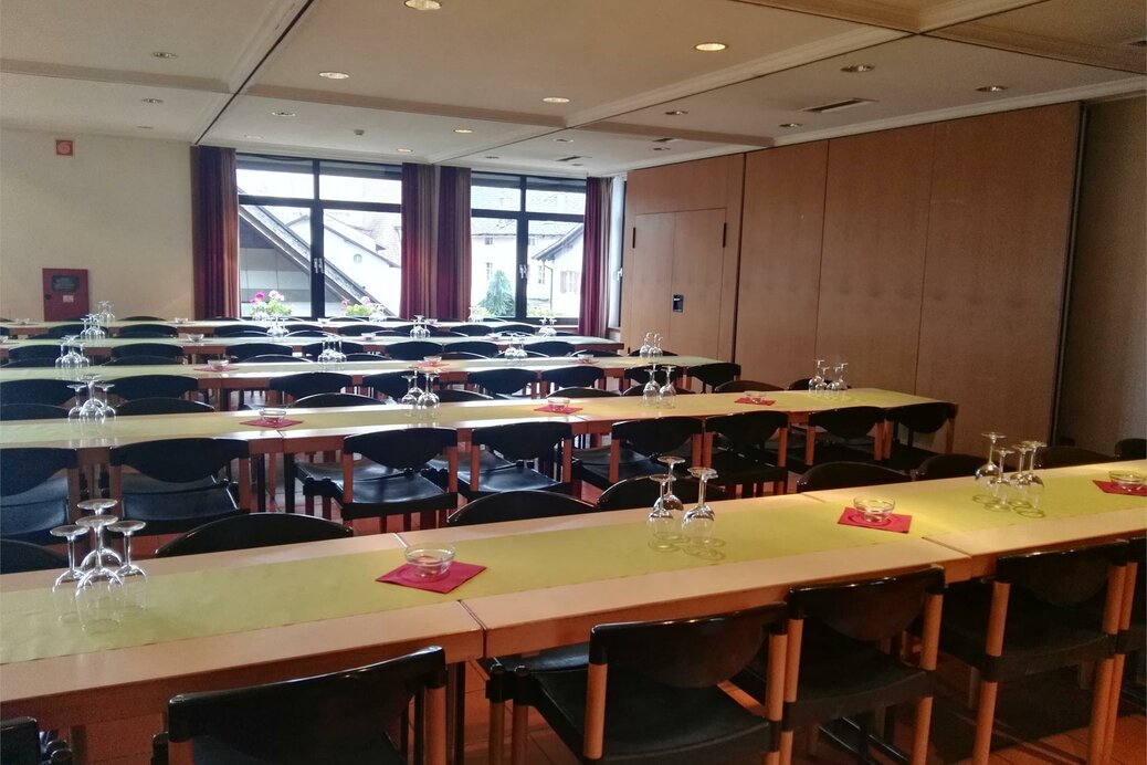 Der kleine Saal kann mit einer Trennwand vom großen Saal abgetrennt werden. Auch im kleineren Saal kann zwischen verschiedenen Anordnungen von Stühlen bzw. Tischen ausgewählt werden.