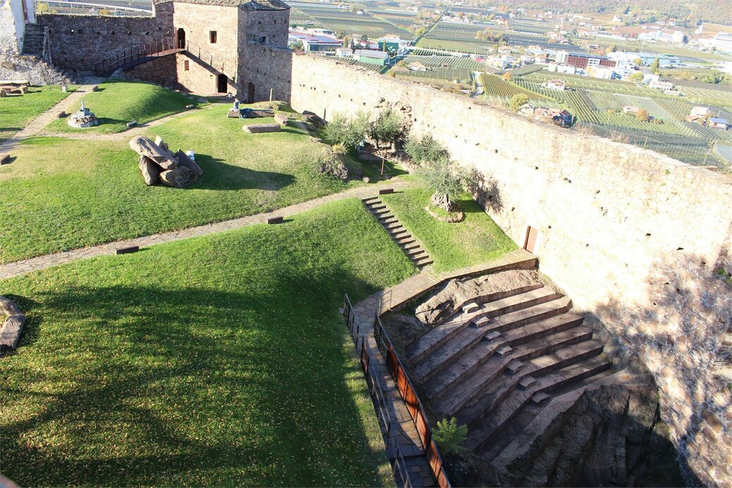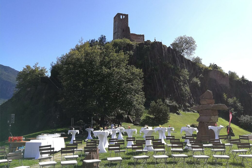 The arena is the largest area at Sigmundskron Castle. Here, too, there is room for several hundred people. This meadow has a slight slope and a podium in the center, this is very suitable for open-air events.