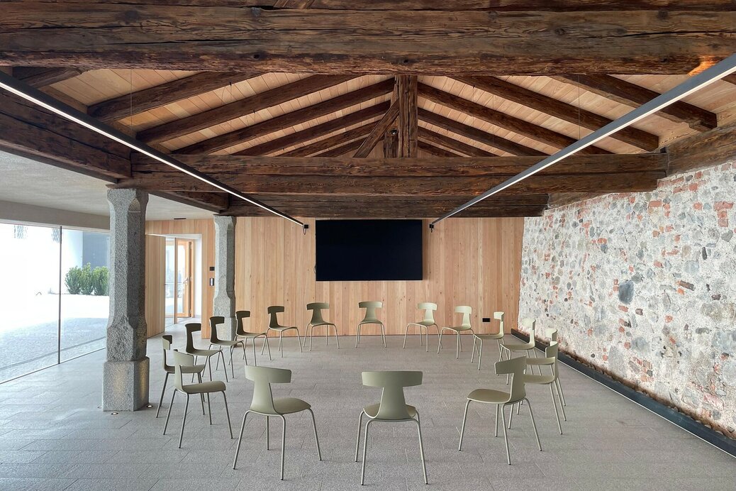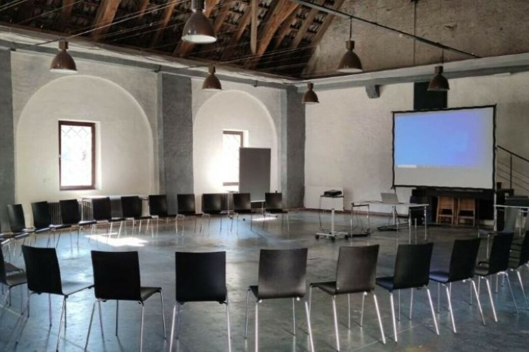 Cozy yet perfectly suited for professional training, the hall named after Bishop Hartmann of Brixen, founder of the monastery, offers a welcoming atmosphere. Looking up, you see a wooden coffered ceiling; looking out, the view opens onto the Schaldern Mountains. Recently, two 98-inch monitors were installed, completing the modern technical equipment.