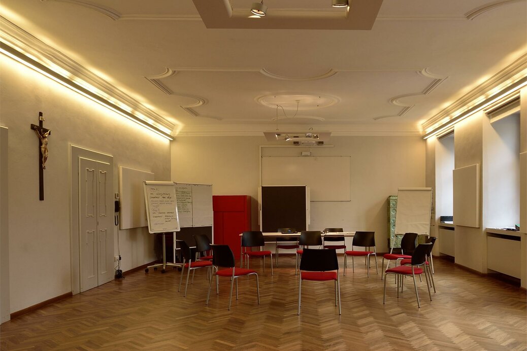 The newly constructed Marien Hall, dedicated to Mary, mother of Jesus, is intentionally designed in a simple style and provides an ideal setting for training and professional development events. New: a mobile screen with a 98-inch monitor, completing the technical equipment.