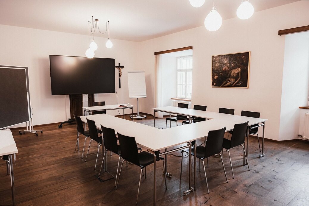 The Säbenersaal is named after the Burgraves of Säben, who in 1142 provided the Bishop of Brixen with enough land for the foundation and endowment of the monastery. It is an elegant, bright, and spacious hall that allows for focused work even in larger groups. Recently, two 98-inch monitors were installed, completing the technical equipment.