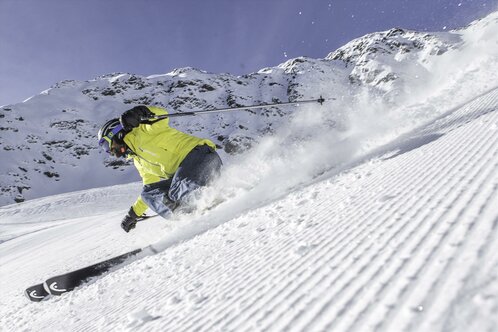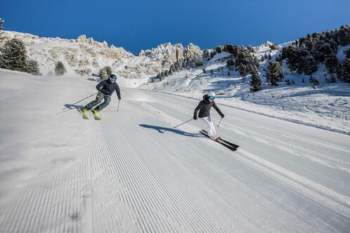In the realm of the world’s most beautiful mountains winter sports enthusiasts embark on a journey of discovery on skis rather than simply going skiing. With a total of 1,200 km of downhill runs to choose from, all ‘skiable’ with a single ski pass, each day you can experience new and ever more stunning scenic descents. Everyone skiing on the slopes must hold valid public liability insurance that covers damaged and injuries to third parties. You can take out suitable insurance when purchasing your ski pass. Minors must wear a helmet when skiing, snowboarding or sledging. The association of 12 large ski resorts comprises 45 smaller, chocolate-box mountain villages ensuring that size must not necessarily mean an impersonal atmosphere. Around 300 snow groomers keep the slopes in perfect conditions and 450 state-of-the-art lift systems eliminate ‘down time’, for example when skiing against the clock on the famous Sellaronda circuit, the heart of the Dolomiti Superski area, and in all adjoining ski resorts. There is plenty to offer snowboarders and skiers of all levels of ability. The area includes several world-famous runs, for example the Bellunese run which begins at the summit of the Marmolada, the Lagazuoi run, the Tognola Uno, the Gran Risa, the Olimpia on the Tofana, the Trametsch, the Silvester and other runs which skiers dream of. The Dolomiti Superski area encourages skiers to indulge their sport to excess, though in fact each skier with a Superski pass uses the same lift on average only 1.34 times per day. At the same time the Sella massif, the Rosengarten, the Civetta and Sassolungo/Langkofel mountains beckon with wonderfully scenic spots where the urge to stop and savour the scenery becomes irresistible. The high mountain location of the ski slopes ranging from 4,920 ft/1,500 m to 10,500 ft/3,200 m and the 1,100 km of downhill pistes serviced by snowmaking equipment ensures abundant snow cover on almost 100% of runs. In addition, the sun shines on 8 out of 10 days. The combination of perfect snow conditions, plenty of sunshine, stunning views and ski runs ensures the most memorable winter sports holidays.