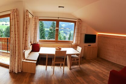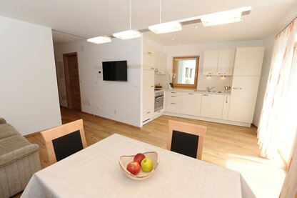 Tutti gli appartameni sono composti da un ampio soggiorno con panca ad angolo, divano-letto, tv satellitare e balcone o terrazza verso sud con vista sull'Alpe di Siusi, l'angolo cucina è dotato di forno, lavastoviglie, piano cottura in vetroceramica, cappa aspiratoria, frigorifero con congelatore, stoviglie, pentole e posate, ogni camera da letto ha i propri servizi con asciugacapelli.